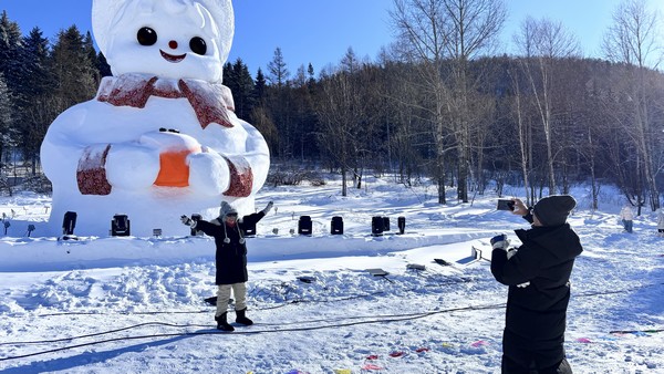 历经20余天精心雕琢,16米的巨型雪人伫立在雪原之上,红绸大花帽配着喜庆围脖,捧着寓意“事事如意”的冻柿子。元旦亮相至今,慕名而来的游客络绎不绝,在大雪人脚下合影留念,欢声笑语为寒冬增添了浓浓暖意,成为今冬雪乡的冰雪地标。