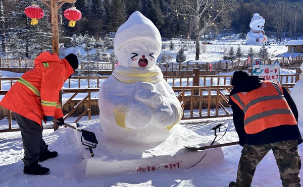 在雪乡的各个街巷,百余个小雪人成为景区最热情的“迎宾员”。不同于16米大雪人与表情包雪人,这些小雪人皆由路面积雪打造而成,工作人员在清雪保障安全通行的同时,将清运的积雪就地取材,让杂乱的雪堆变身形态各异的小雪人,用最质朴的创意诠释“游客至上”的理念。正是这份对细节的打磨,让雪乡的冬日不仅有壮阔的冰雪风光,更有触手可及的温暖与诗意。