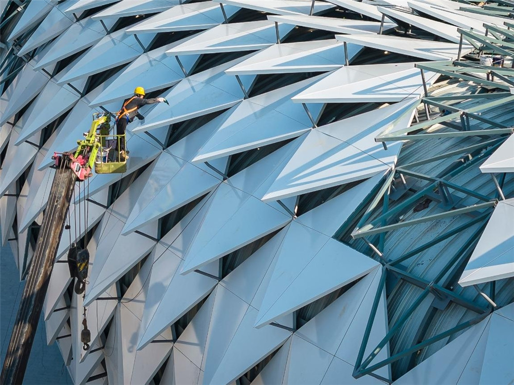 1月8日,工人在宿州市奥体中心项目现场进行作业。该中心是2026年安徽省第十六届运动会、第九届省残运会、第十届省少数民族传统体育运动会的开闭幕式主会场,涵盖体育场、游泳馆、综合型全民健身中心及配套设施等。目前,体育场看台主体、钢结构施工已完成,室内外装饰装修及屋面施工作业已进入收尾阶段,预计今年3月投入使用。(本报记者 范柏文 摄)