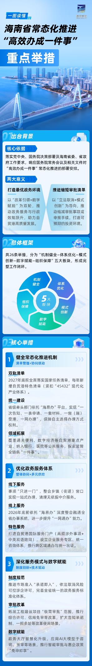 人民网海口12月28日电 (记者李学山)为深入贯彻落实党中央、国务院关于优化政务服务、提升行政效能的决策部署,持续深化“放管服”改革,近日,海南省营商环境建设厅联合有关部门制定印发《海南省常态化推进“高效办成一件事”重点举措》(以下简称《重点举措》),以制度化、常态化机制推动政务服务从“能办”向“好办、快办、易办”全面跃升,着力打造市场化、法治化、国际化的一流营商环境,为海南自由贸易港高质量发展提供坚实支撑。
