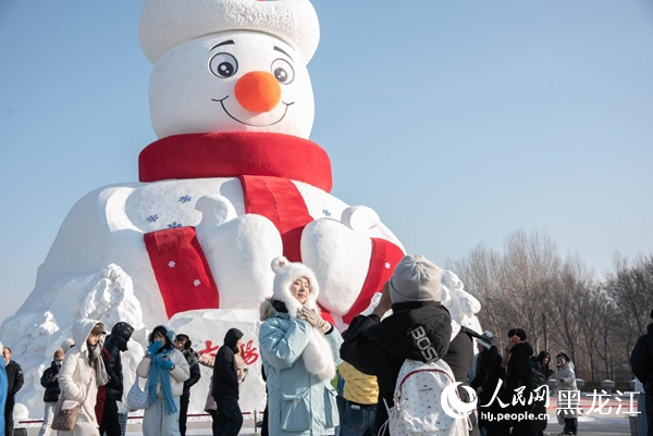 入口处游客与雪人先生合影欢笑不断