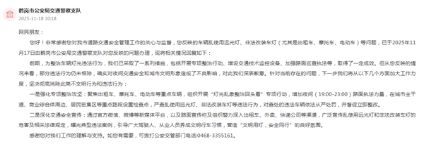 鹤岗市公安局交通警察支队对网民反映的问题进行了回复,前期,为整治车辆灯光违法行为,已采取了一系列措施,包括开展专项整治行动、增设交通技术监控设备、加强路面巡查执法等,取得了一定成效。