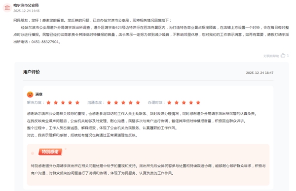 该网民对办理结果表示满意,称公安机关及时受理、耐心沟通,民警多次与商户进行协调,督促其降低时钟播报音量,积极回应群众诉求。