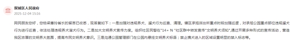 对此,哈尔滨市双城区人民政府表示,将加强对违规养犬、遛犬行为巡查清理。辖区承旭派出所重点时段加强巡逻,对承旭公园重点部位违规遛犬行为进行巡查,依法处理违规养犬遛犬行为;加大文明养犬宣传力度,组织社区民警在“14+N”社区群中转发宣传“文明养犬须知”,通过开展多种形式的宣传活动,营造全区浓厚的文明养犬氛围,提高市民文明养犬意识;沟通公园管理部门在公园内悬挂文明养犬标语;禁止携犬进入的区域设置明显的禁入标志等。