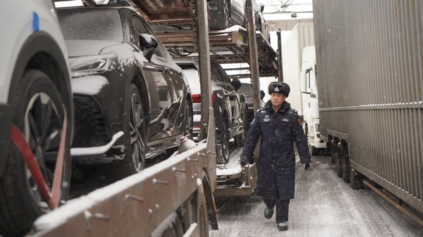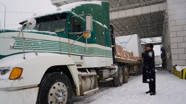 2月5日上午,正值口岸出入境高峰时段,口岸出入境客流、货流较平日显著增加,暴雪天气导致公路能见度急剧下降,部分路段积雪结冰,通关车辆行进缓慢。绥芬河边检站闻“雪”而动,加强与海关、公路运输等部门的联动协调,实时通报天气及通关信息,增派警力前置引导,采用“分段放行、分批查验”等方式,加快车辆验放速度,减少旅客和货车在严寒中的等待时间。