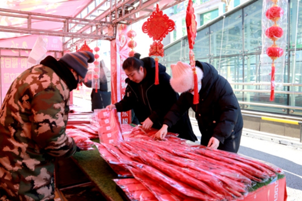 走进新春大集区,百种东北冬季特色冻货琳琅满目,刀鱼、黏豆包、冻梨、冻柿子……吸引着市民们纷纷驻足挑选。春联、福字搭配红灯笼、中国结,营造出喜庆祥和的氛围。非遗剪纸、根雕、蔓越莓面包等特色产品更是让人眼前一亮。