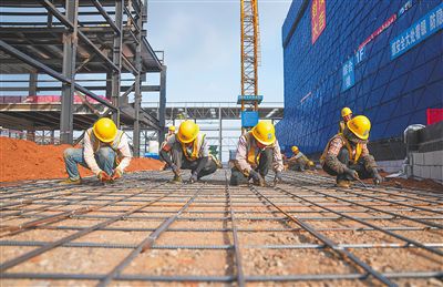 1月12日,海南国际智慧物贸云港项目建设现场,上百名工人正加紧施工。图为工人在绑扎钢筋。