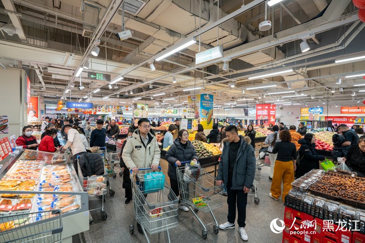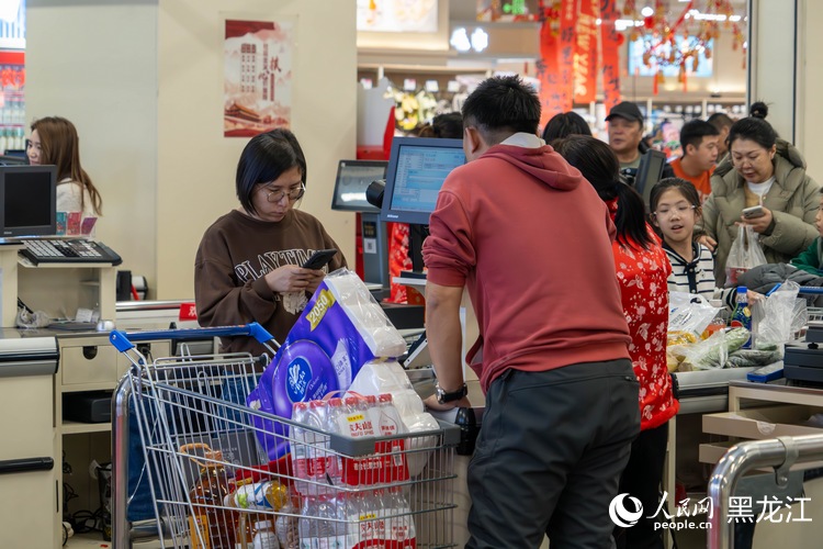 商超里也是一片繁忙景象。在一家大型超市,米面油、肉蛋奶等民生商品摆满货架,新春礼盒、特色零食分区陈列,不少市民推着满满一车年货排队结账。“给孩子买了进口巧克力,给爸妈备了坚果礼盒,再买点冻梨、粘豆包,都是过年的味道。”市民张先生边说边向记者展示购物车。