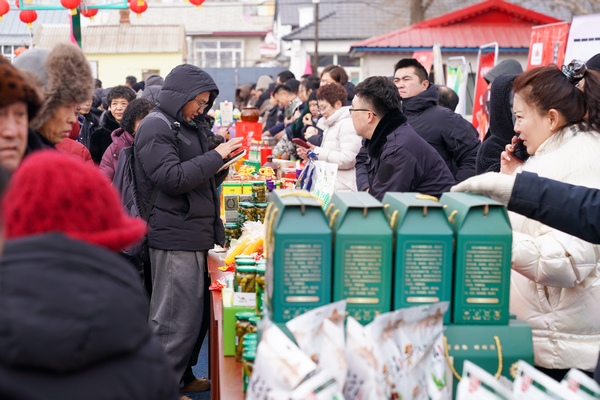 非遗展示区内,手工布艺、“麻花布”印染、松江编结、鱼皮画、剪纸等传统技艺集中亮相。年货大集吸引二十余家本地企业与合作社参展,甜糯玉米、古法大豆油、珊瑚猴头等特色产品及冰糖葫芦、炒瓜子、冻货等传统小吃展销两旺。