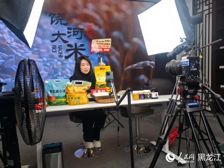 主播袁宝秋介绍饶河大米。人民网记者 张齐摄
