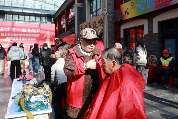 同日,“在这里,遇见文明”佳木斯市新时代文明实践集市志愿服务项目示范活动启幕。红色的志愿服务旗帜迎风招展,“奉献、友爱、互助、进步”的标语格外醒目,12个部门的107名志愿者身着统一志愿服装,带着饱满的热情搭建起服务市民的“暖心驿站”,理发、义诊、普法、非遗展示等多项便民服务密集铺开,让雷锋精神在基层一线落地生根、开花结果。