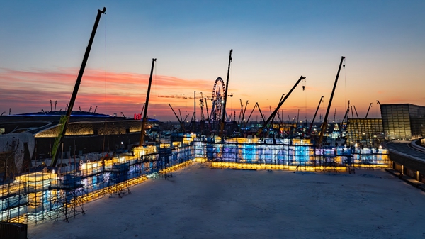 人民网哈尔滨12月6日电 (记者张哲鑫)第二十七届哈尔滨冰雪大世界园区建设正酣,作为本届哈尔滨冰雪大世界核心景观之一的主形象大门,目前建设进度已过半。