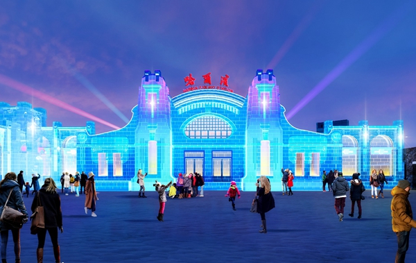 据了解,第二十七届哈尔滨冰雪大世界的主形象大门,以老哈尔滨火车站经典轮廓为蓝本,复刻了百年枢纽的形象,既彰显城市厚重绵延的文脉,又以冰的清透质感装点北国冬日,成为一座融合了记忆温度与视觉美学的城市地标。