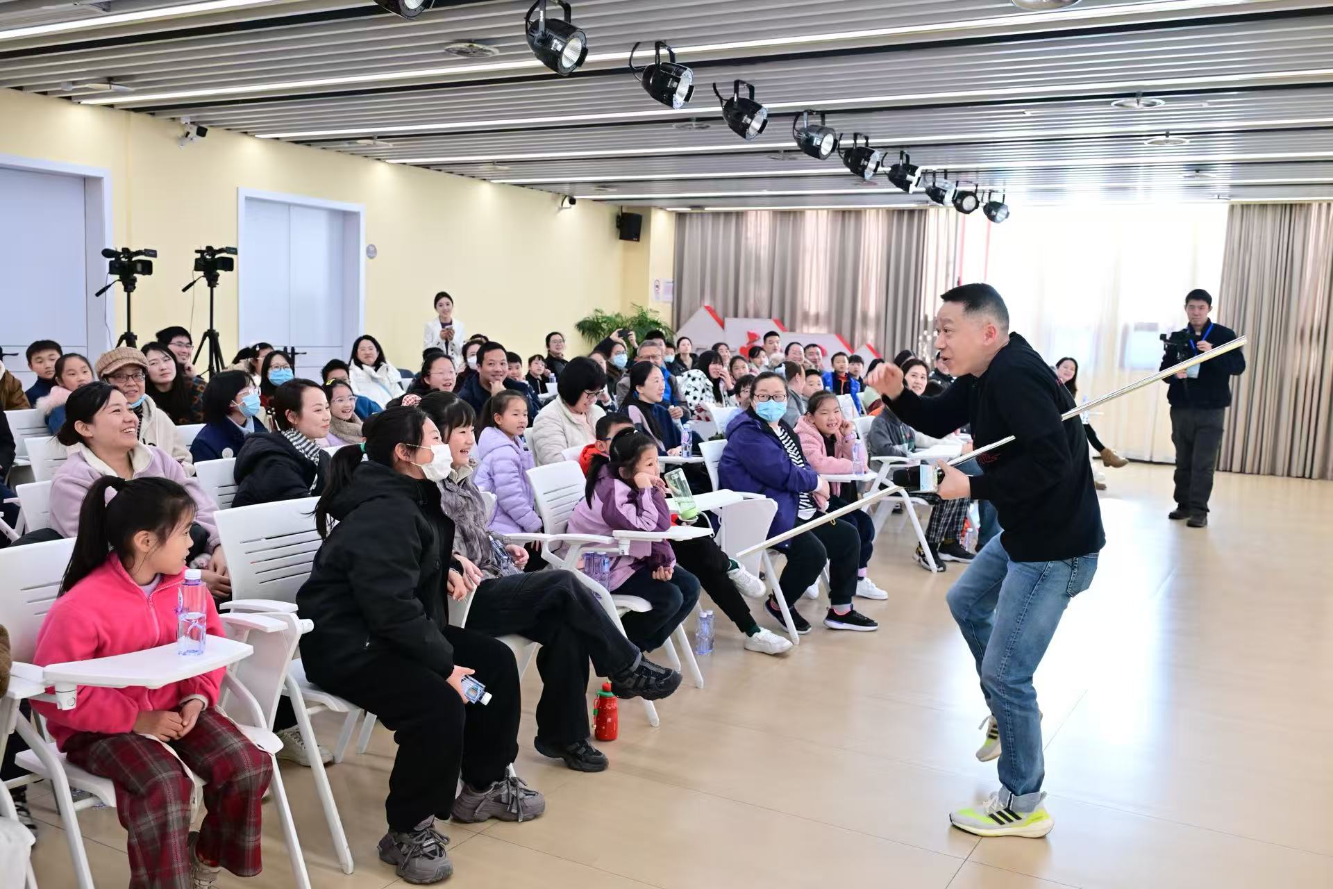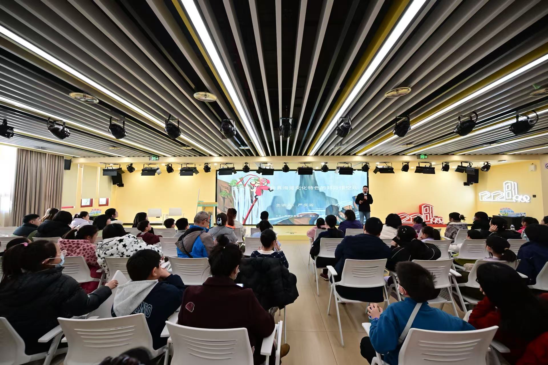 上海京剧院一级演员、郑派悟空戏第三代传人严庆谷应邀主讲,以“大圣来也——独具海派文化特色的郑派悟空戏”为主题,带领40组亲子家庭走进孙悟空的海派艺术世界,领略传统戏曲的独特魅力与人文底蕴。