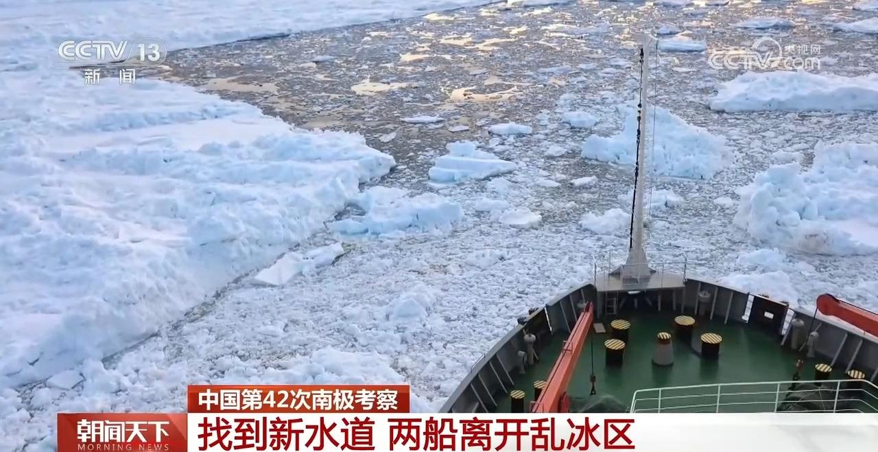 随着时间的推移,前面的乱冰有了松动的迹象,“雪龙”号经过连续几次的前冲,推开乱冰后,顺利进入了前面的水道。在“雪龙”号脱困一天后,“雪龙2”号也找到了一条新的水道,离开了乱冰区。