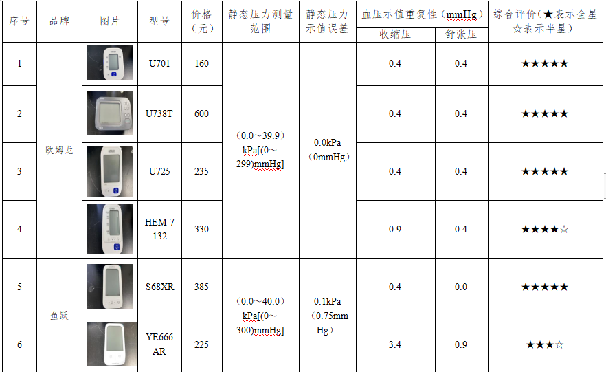 结合此次比较试验结果,宁波市消保委发布消费提示:臂式电子血压计静态压力测量范围一般在外包装上会有明显标注,消费者选购时可留意。若没有,可翻阅说明书,确认测量范围能达到(0.0—34.7)kPa[(0—260)mmHg]。