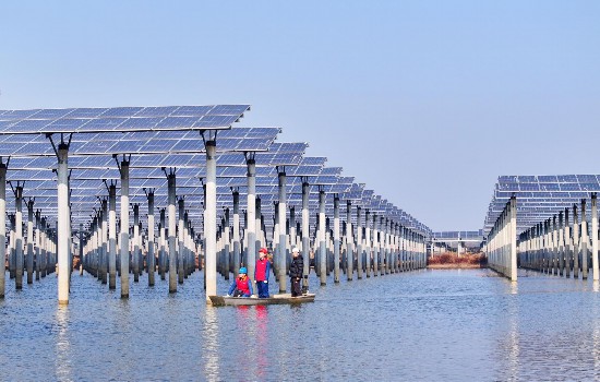 近年来,该市利用湖泊滩涂资源,建设“上层发电,下层全域养殖”的立体农光模式,拓宽了群众增收渠道,并推动能源清洁低碳转型,促进当地经济、生态高质量发展。(本报通讯员 宋卫星 摄)