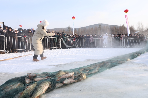 活动现场,备受期待的冬捕拉网环节如期而至,伴随着雄浑高亢的号子声,工作人员在冰封的湖面上齐心协力牵引渔网,当千余斤鲜鱼随着渔网缓缓出水、跃出冰面,现场观众发出阵阵欢呼,并用手机记录这一壮观场面。