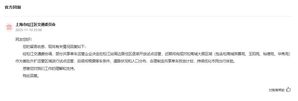 对此,上海市松江区交通委员会积极协调,推动共享单车企业建立精细化调度机制。在回复中,上海市松江区交通委员会表示,部分共享单车运营企业决定在松江站周边居住区逐渐开放试点运营,近期将完成对松南城大居区域作为首批外扩运营区域进行试点运营,后续将根据停车条件、道路状况和人口分布,合理制定共享单车投放计划,持续优化市民出行体验。