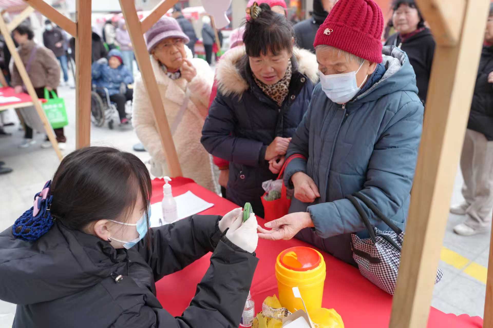 市集现场,老中青志愿者忙碌的身影随处可见,处处彰显着对老年群体的细致关怀。街道老年协会志愿者带来免费理发、衣物缝补、小家电维修等“接地气”服务;社区卫生服务中心、日月星护理院设摊义诊,提供健康问诊、血糖检测等公益服务,切实解决老人日常健康需求。