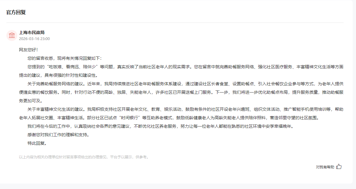 对此,上海市民政局表示,该网友提到的“吃饭难、看病远、陪伴少”等问题,真实反映了当前社区老年人的现实需求,建议具有很强的针对性和建设性。