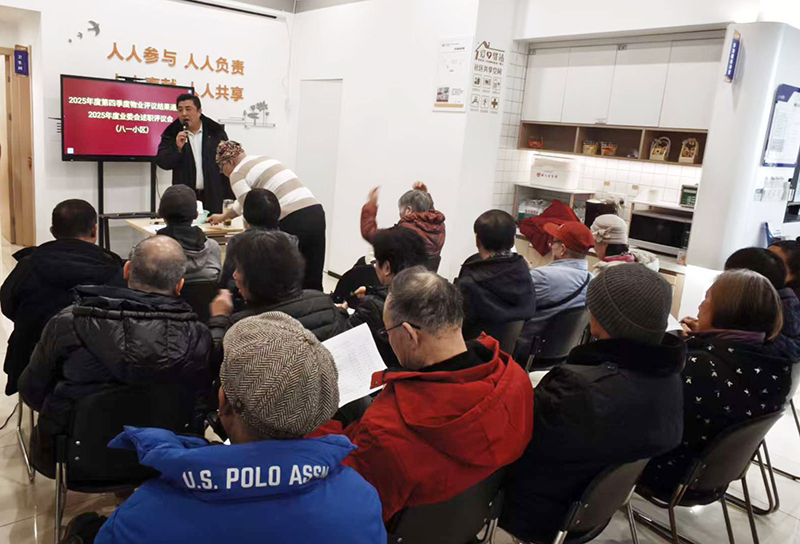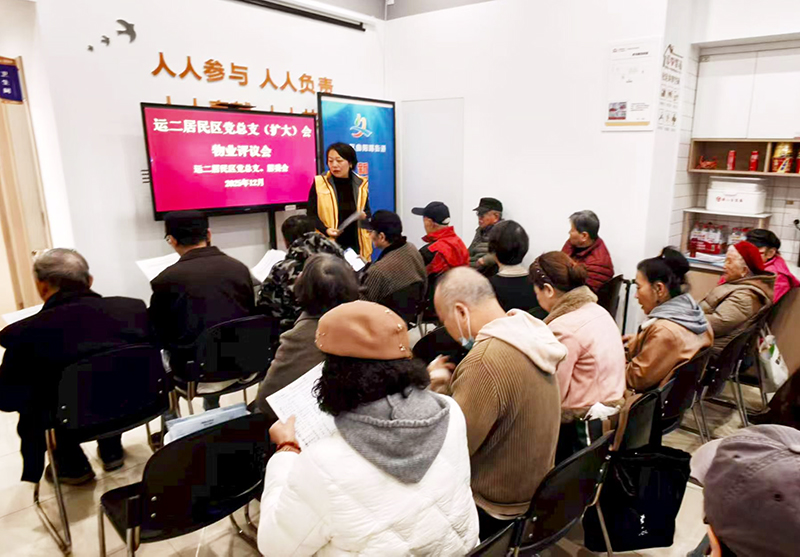 2023年底,这一制度在运二居民区先行先试。从最初“怕失控、怕吵架”,到如今每季度评议常态化、流程规范化,一套“党组织牵头、居民做主、物业述职、公开评议”的模式逐渐成型。大会上,物业经理现场述职,亮成绩、摆问题、说计划;居民代表、业委会成员、社区党员当场打分、匿名测评,保洁、保绿、报修、保安、设施维护五大项,件件关系大家的切身感受。