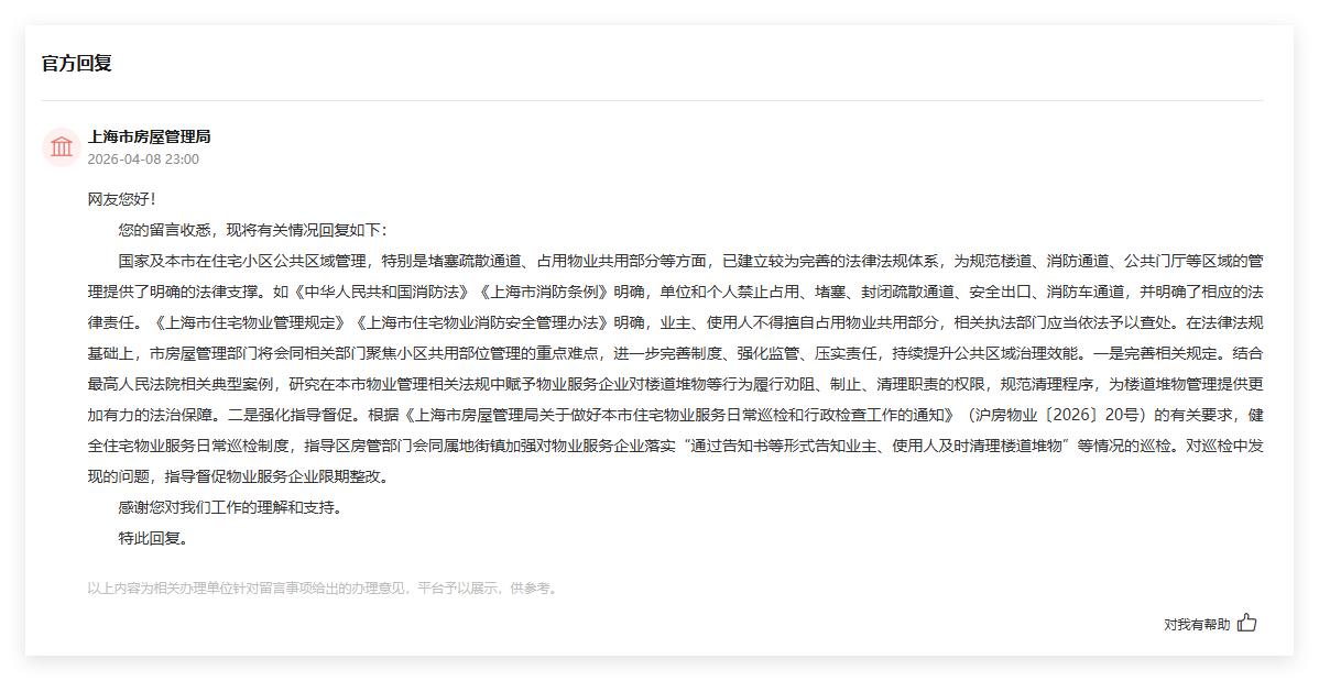 收到留言后,上海市房屋管理局回复称,国家及上海市在住宅小区公共区域管理,特别是堵塞疏散通道、占用物业共用部分等方面,已建立较为完善的法律法规体系,为规范楼道、消防通道、公共门厅等区域的管理提供了明确的法律支撑。