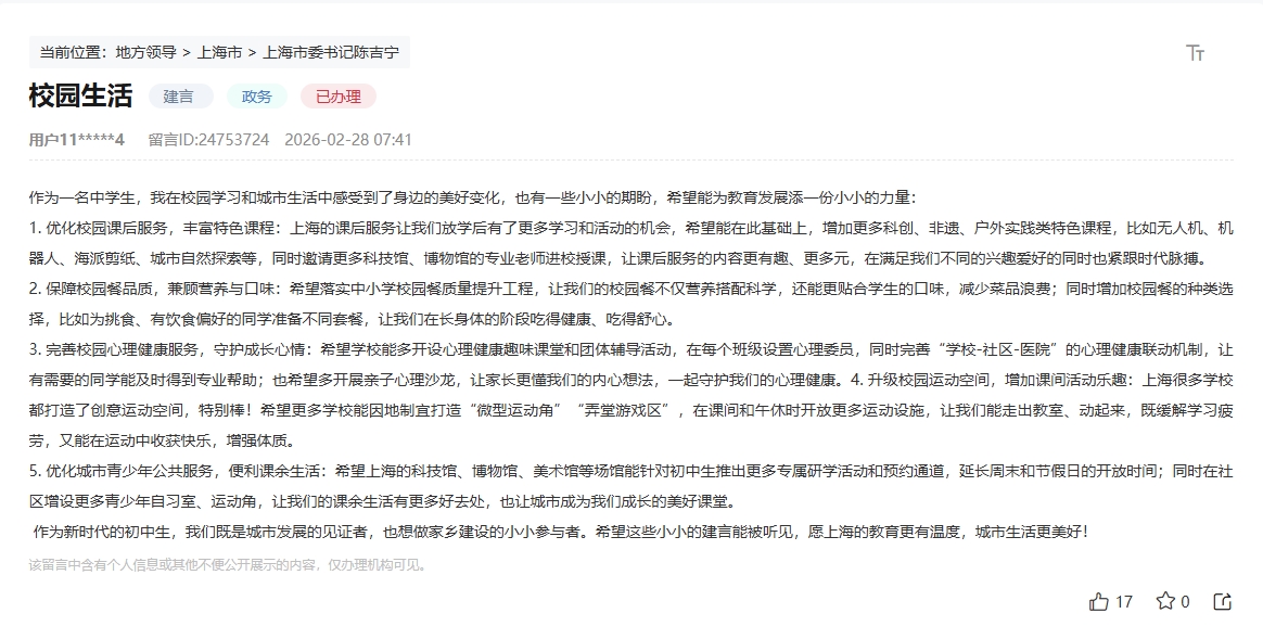 人民网上海4月10日电 (记者董志雯)近期,一名中学生通过人民网“领导留言板”留言,从校园课后服务、校园餐品质、心理健康服务、运动空间升级、城市青少年公共服务等五个方面提出建议,希望上海的教育更有温度、城市生活更美好。