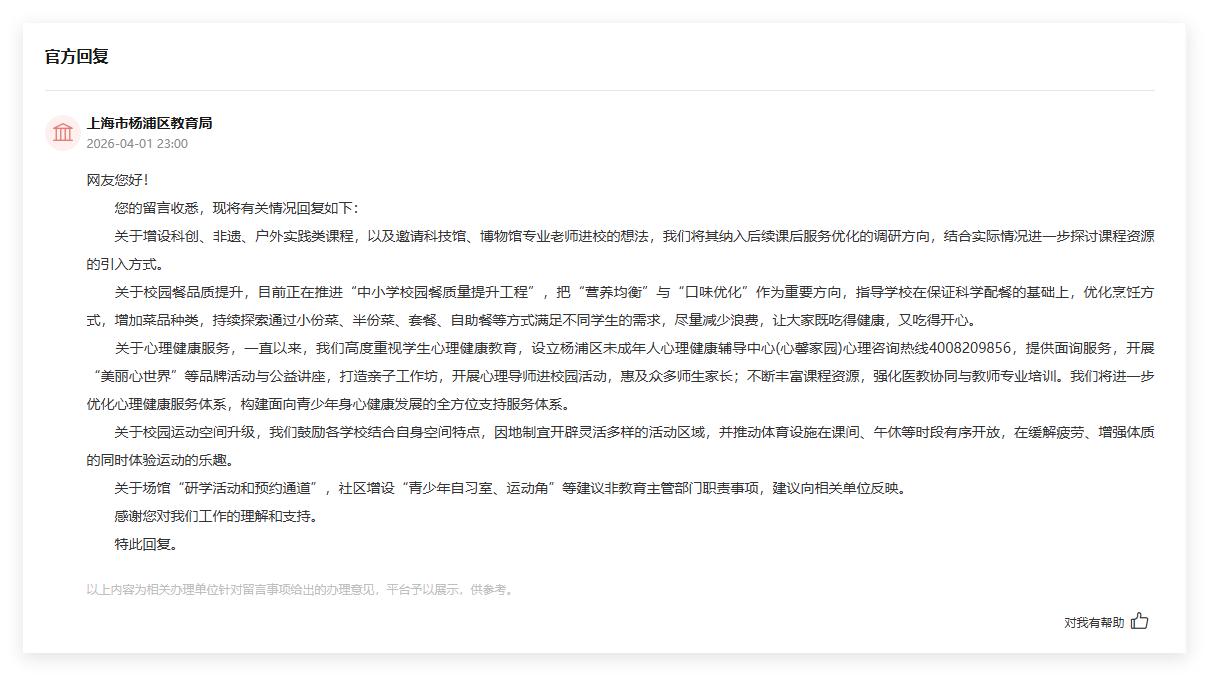 收到留言后,上海市杨浦区教育局逐条作出回应: