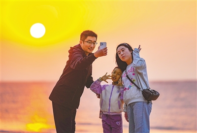 1月3日,游客在海口秀英区荣山寮村拍照打卡,在落日余晖中定格假期美好。