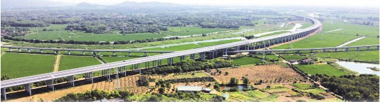天天高速(天长-天柱山)路基6标段的月山特大桥、上跨江北港铁路桥、马家墩大桥“三桥合一”壮观景象。徐文娟 摄