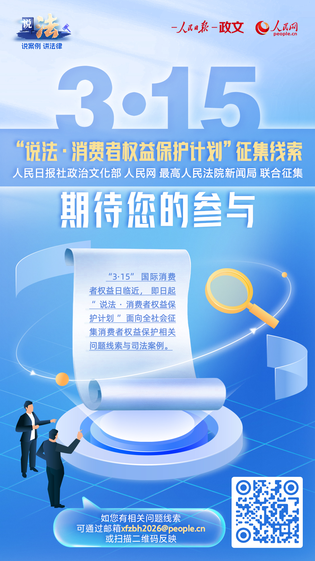 “3·15”国际消费者权益日临近,人民日报社政治文化部、人民网联合最高人民法院新闻局,自即日起开展“说法·消费者权益保护计划”,面向全社会征集消费者权益保护相关问题线索与司法案例。