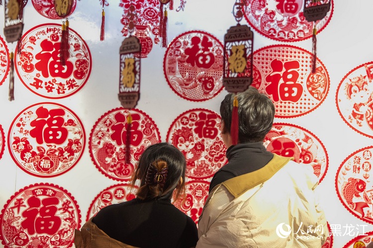 哈尔滨道里区透笼轻工批发市场内,顾客挑选购买春联、福字。