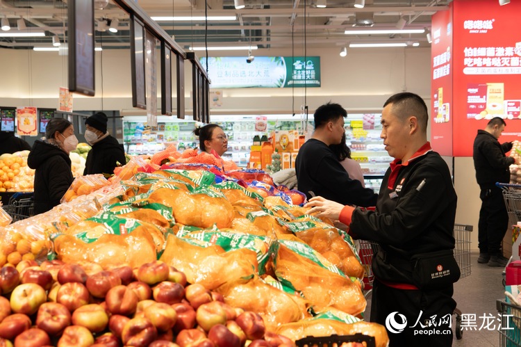 商超里也是一片繁忙景象。在一家大型超市,米面油、肉蛋奶等民生商品摆满货架,新春礼盒、特色零食分区陈列,不少市民推着满满一车年货排队结账。“给孩子买了进口巧克力,给爸妈备了坚果礼盒,再买点冻梨、粘豆包,都是过年的味道。”市民张先生边说边向记者展示购物车。