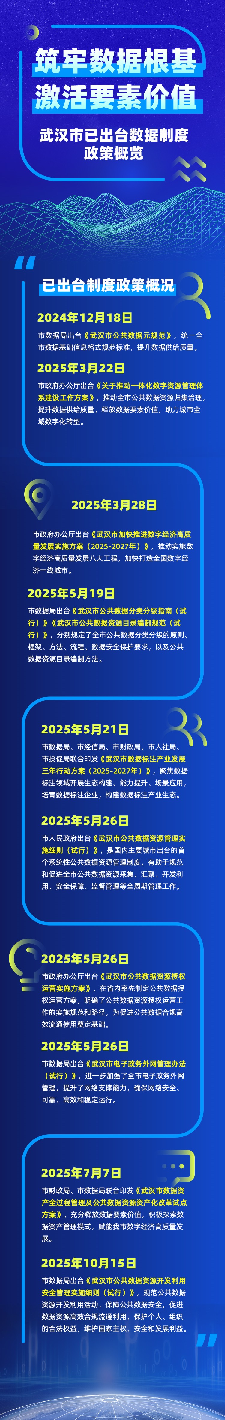 武汉市数据局围绕数据要素市场化配置改革主线,加快完善数据资源管理和开发利用各项基础制度和政策措施,加强制度和政策宣传解读,为数据“供得出、流得动、用得好、保安全”提供有力保障,服务助力国家数据要素综合试验区建设武汉实践。(武数宣)