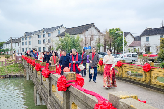 随后,白鹤元宵习俗的“走三桥”如约而至,祥狮引路、丝竹相随,大家手提元宵灯彩,依次走过马巷桥、东周桥和旺巷桥,沿途设置了投壶、蹴鞠、捶丸等打卡集章祈福活动,更有白鹤本土品牌“青衣舍”传统服饰走秀和青龙镇古诗词朗诵展示。一路上,丝竹声、欢声笑语不断,邻里们边走边唠家常,热闹又温馨。这一走,走的是民俗,是团圆,更是白鹤人彼此的牵挂,几百年来,一直是元宵最动人的一道风景。