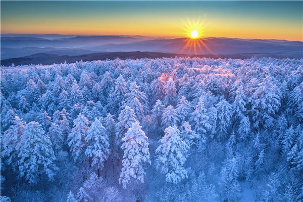大箐山森林公园主峰海拔1203米,是小兴安岭第二高峰。冬日里,银装素裹的林海、晶莹的雾凇、壮阔的云海与山间旋转的风车,构成一幅北国冰雪画卷,与南方冬日景致形成鲜明对比,成为南方游客追逐冰雪的新兴目的地。