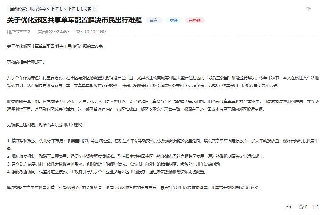 人民网上海12月23日电 (记者葛俊俊)交通出行,不仅关乎市民的日常体验,也是城市治理能力与温度的直接体现。近期,多位上海网友通过人民网“领导留言板”建言献策,围绕从共享单车到公交优化的各类出行问题建言献策。上海相关部门认真倾听、积极回应,将市民的“烦心事”当作城市运行的“大事”来办,让每一条留言化为提升城市品质的实际行动。