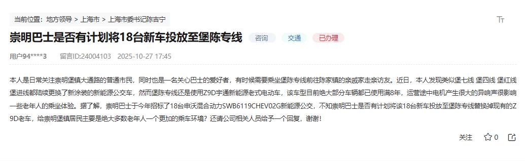 该网友了解到,崇明巴士于今年招标了18台申沃混合动力新能源公交,他询问崇明巴士是否有计划将该18台新车投放至堡陈专线。