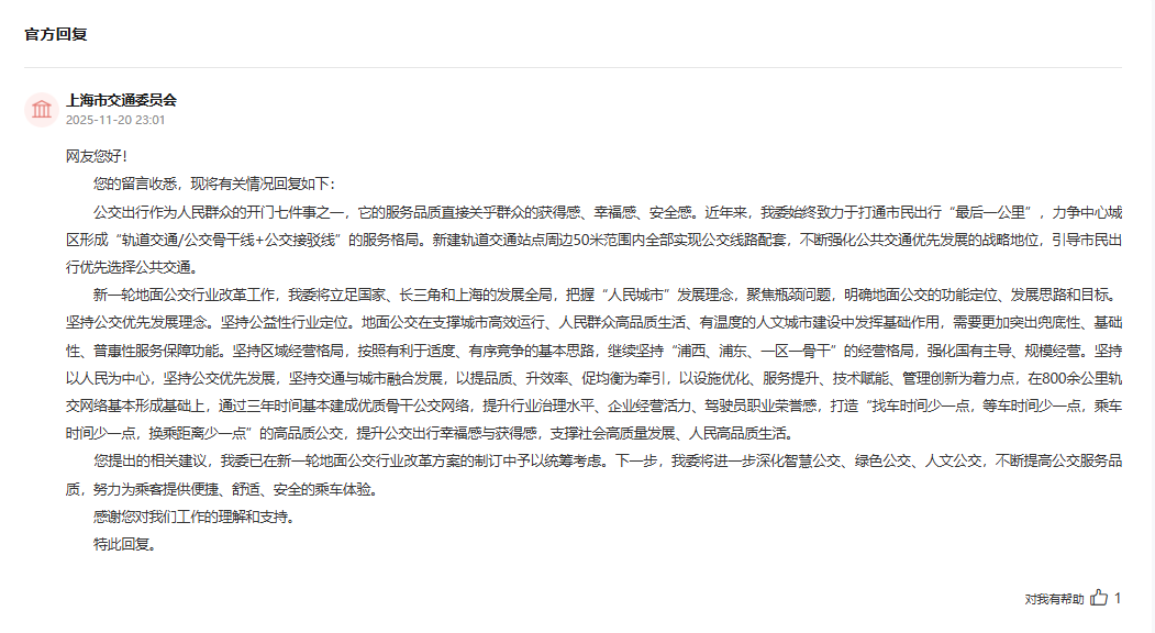 上海市交通委员会对此高度重视,表示相关建议已在新一轮地面公交行业改革方案中统筹研究。下一步,上海将以“智慧公交、绿色公交、人文公交”为导向,不断优化网络、提升服务,推动地面公交更好适配城市发展新格局与市民高品质生活新需求。