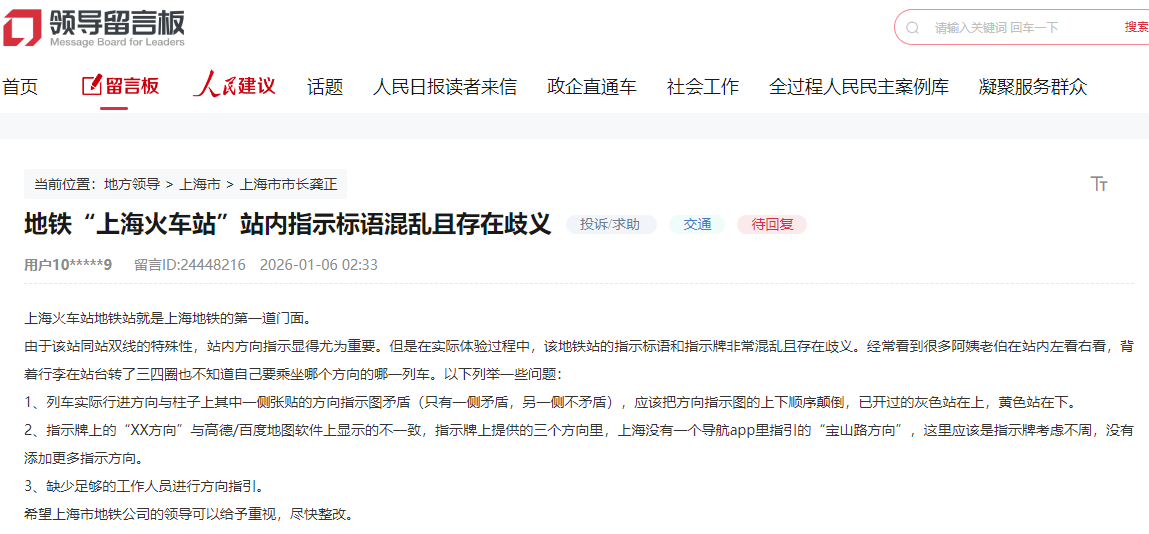 该网友在留言中列举了三点问题:1、列车实际行进方向与柱子上其中一侧张贴的方向指示图矛盾(只有一侧矛盾,另一侧不矛盾),应该把方向指示图的上下顺序颠倒,已开过的灰色站在上,黄色站在下。 2、指示牌上的“XX方向”与高德/百度地图软件上显示的不一致,指示牌上提供的三个方向里,上海没有一个导航app里指引的“宝山路方向”,这里应该是指示牌考虑不周,没有添加更多指示方向。 3、缺少足够的工作人员进行方向指引。