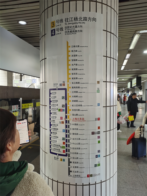 关于部分指示图方向问题,上海地铁表示,该立柱导向为3/4号线上海火车站站台竖向单线图,其主要用于显示该侧站台列车可达站点及运行终点方向,并不代表列车实时的行进方向。结合车站的客流特点,上海地铁将运行终点等关键信息设置于图示上方,以方便乘客快速识别。建议候车时,可参照站台显示屏及站台门上方线路图的箭头方向确认列车行进路径。