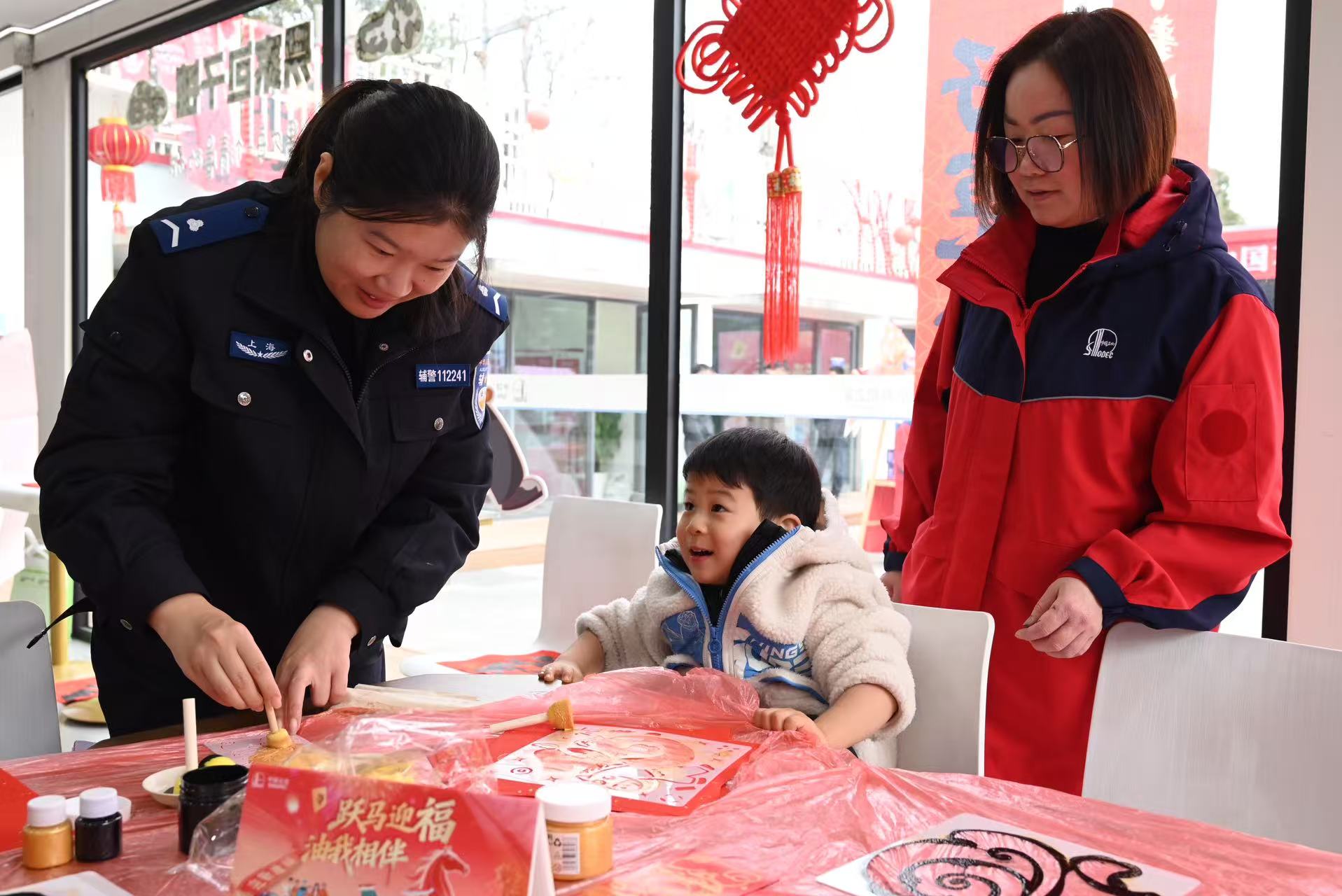 上午10点,泰和路加能站主会场早已热闹非凡。室外广场上,“迎新接福”“马到成功”“快马加鞭”等趣味游戏排起长队,司机们在轻松竞技中传递祝福、收获喜悦;室内一楼,来自宝山区社区治理学院的书法志愿者现场挥毫泼墨、书写春联,一旁的“马到福印”DIY手工区,志愿者们指导司机朋友们拓印福印、制作红包,红纸翻飞间将浓浓年味送至手中。