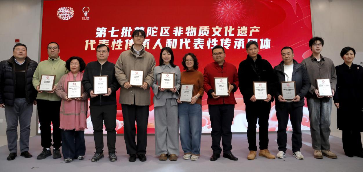 现场隆重举行了第七批普陀区非物质文化遗产代表性项目、传承人和传承团体颁牌仪式。此次授牌进一步壮大了普陀非遗传承队伍,完善区域非遗保护体系,也为新春非遗传播、节庆文旅活动开展储备了优质内容与核心力量。