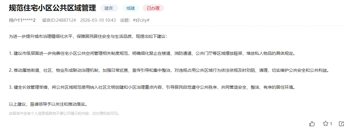 该网友提出三点具体建议:一是建议市级层面进一步细化禁止在楼道、消防通道等区域堆放杂物的具体规定;二是推动街道、社区、物业形成联动治理机制,加强日常巡查与集中整治;三是健全长效管理举措,将公共区域规范使用纳入社区文明创建和小区治理重点内容。