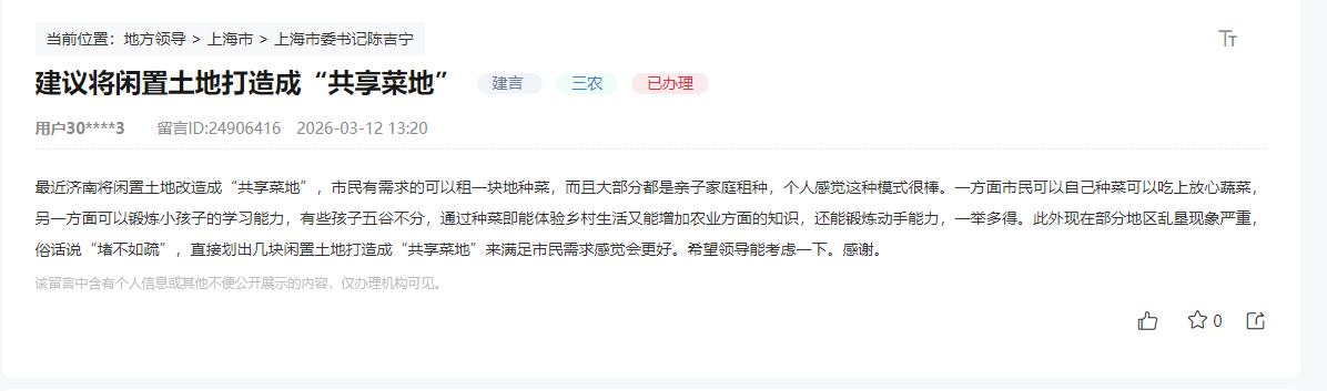 近日,有上海网友在人民网“领导留言板”上留言称,希望将闲置土地打造成“共享菜地”。