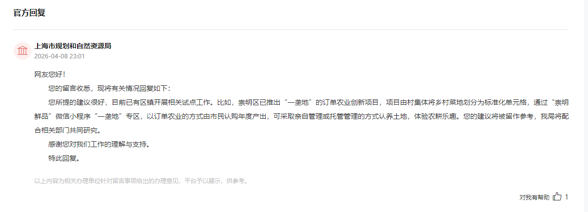 对此,上海市规划和自然资源局表示,该网友所提的建议很好,且目前已有区镇开展相关试点工作。比如,崇明区已推出“一垄地”的订单农业创新项目,项目由村集体将乡村菜地划分为标准化单元格,通过“崇明鲜品”微信小程序“一垄地”专区,以订单农业的方式由市民认购年度产出,可采取亲自管理或托管管理的方式认养土地,体验农耕乐趣。