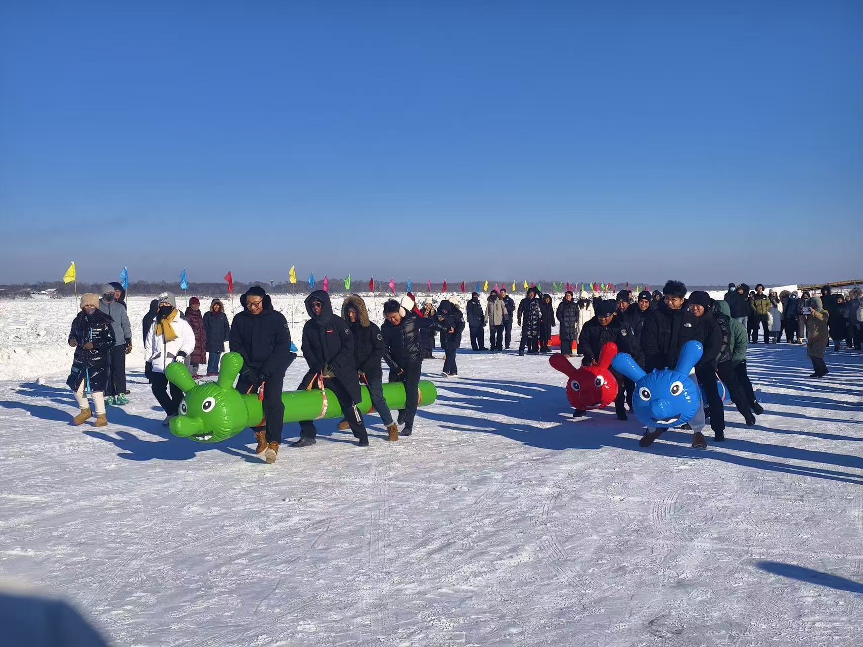 当天,界江冰雪恐龙乐园举办“冰超”嘉荫县界江冰雪运动体验赛,涵盖冰上拔河、雪地足球、冰壶等多种项目。乐园今年面积扩大至3万平方米,新增三条主题滑梯。界江冰钓休闲大赛也同步开展,吸引了来自全国的钓友参与。