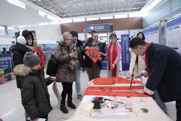 每一位走进出境大厅的中俄游客,一看到大红春联纸整齐铺开,书法志愿者在挥毫书写,就不自觉地围拢到桌旁,好奇地注视着书法志愿者笔锋流转,饱满圆润的“福”字跃然纸上,年味十足的“春回大地福满门”的春联新鲜出炉,他们小心翼翼地接过去,用中文说着“谢谢”。这一刻,中华优秀传统文化为桥,祝福与温暖融入笔墨、好客与热情绘成微笑,中俄文化交融与中俄友谊化为具象。这温馨的一幕一幕,正是绥芬河市第十九届“金马迎春 福满口岸”写春联送祝福活动的生动缩影。