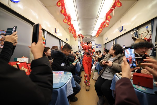 行程中,列车餐车变身为“移动文化展厅”,开展东北秧歌教学、剪窗花、包饺子等活动。来自漠河的非遗代表性传承人还现场展示了鄂伦春族小调、传统桦树皮烙画、口技、太阳花制作等技艺,吸引众多外国旅客踊跃参与。